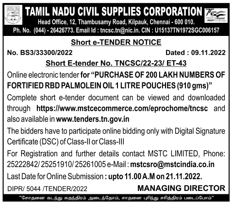 Online electronic tender for “PURCHASE OF 200 LAKH NUMBERS OF FORTIFIED RBD PALMOLEIN OIL 1 LITRE POUCHES (910 gms)”