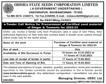 Tender for Purchase of Certified seed material of Ginger & Turmeric for 2022-23