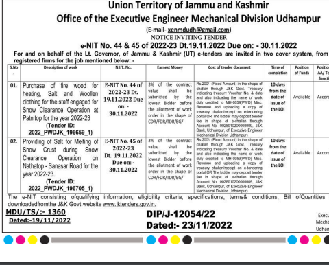 Tender for Purchase of fire wood for heating, Salt and Woollen clothing for the staff engaged for Snow Clearance Operation at Patnitop for the year 2022-23