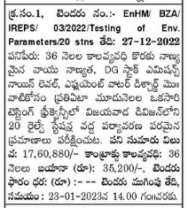 Tender for Quality of Air Quality, DG Stack Emissions Noise Level, Effluent Water Discharge etc. for a period of 36 months. For them, every year at the testing frequency of every three months at 20 railway stations in Vijayawada division. Testing standards.