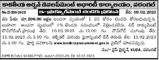 Tender for r 1 work with an estimated cost of Rs.200.00 lakhs. Bayana: 1% of estimated cost to be paid at the time of tender. Starting Date of Bid Document Downloading: 10.02.2023 12.00 hrs. Download End Date: 13.02.2023 3.00 hrs. Technical and Financial Bid Opening Date: 13.02.2028 3.00 hrs. Full details can be found at www.lendereprocurementl.gov.in. DIFR RO No 12:00 PEC AMC 112022-23, DI 10022023 No. Vice Chairman, KUDA, Warangal