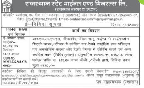 Tender for R. s. M.M.L. Loading and unloading in limestone ballast dumper / tipper from Sanu Mines located at Jaisalmer, transportation to railway siding and loading in railway wagons