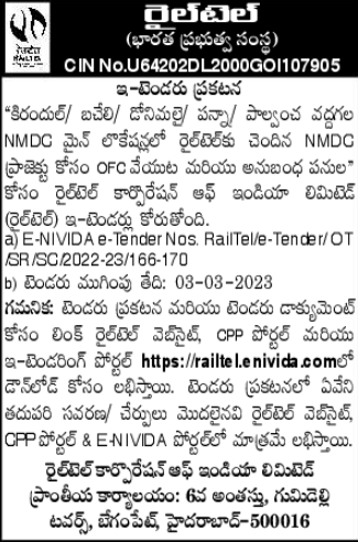 Tender for Railtel Corporation of India Limited for “Laying of OFC and ancillary works for NMDC project of Raile at NMDC mine locations at Kirandul/ Bacheli/ Donimalai Panna/ Palvancha