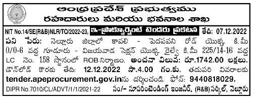 Tender for Railway Km 225/14-16 of Guduru – Vijayawada Section at Km 10/0-6 of Kavali Pedapavani Road in Nellore District LC No. Construction of ROB