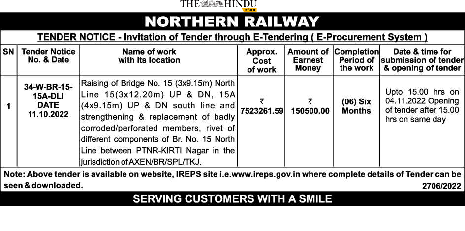 Raising of Bridge No. 15 (3×9.15m) North Line 15(3×12.20m) UP & DN, 15A (4×9.15m) UP & DN south line and strengthening & replacement of badly corroded/perforated members, rivet of different components of Br. No. 15 North Line between PTNR-KIRTI Nagar in the jurisdiction of AXEN/BR/SPL/TKJ.