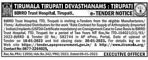 Tender for “Rate Contract for Supply of Arthroplasty Imported /Indian) Implants (USFDA Certificate mandatory) on Consignment Case to Case Basis to BIRRD Trust Hospital, TTD, Tirupati for a period of Two Years NIT Roc,No TTD
