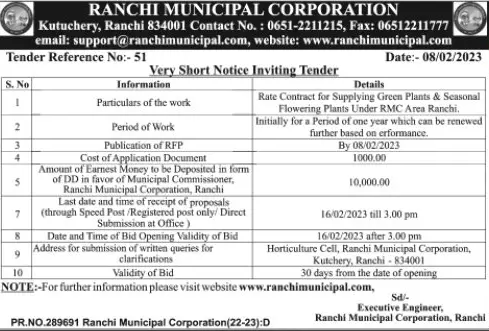 Tender for Rate Contract for Supplying Green Plants & Seasonal Flowering Plants Under RMC Area Ranchi,