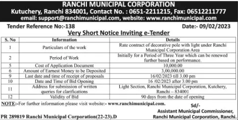 Tender for Rate contract of decorative pole with light under Ranchi Municipal Corporation Area Initially for a Period of Three Year which can be renewed further based on performance,