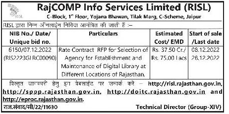 Tender for Rate Contract RFP for Selection of Agency for Establishment and Maintenance of Digital Library at Different Locations of Rajasthan. EstimatedStart of sale