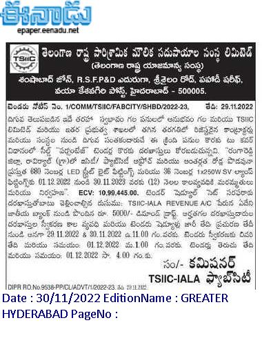 Tender for Raviryal (G) Existing 680) Nos. LED Street Light Fittings and 36 Nos. 1x250W SV Lamps along ECity/ Fabset
