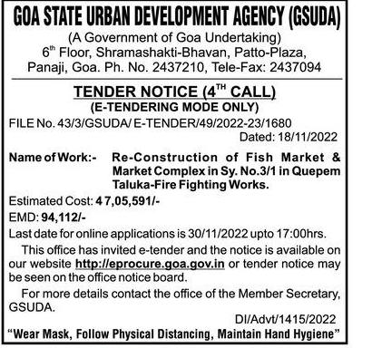 Tender for Re-Construction of Fish Market & Market Complex in Sy. No.3/1 in Quepem Taluka-Fire Fighting Works.