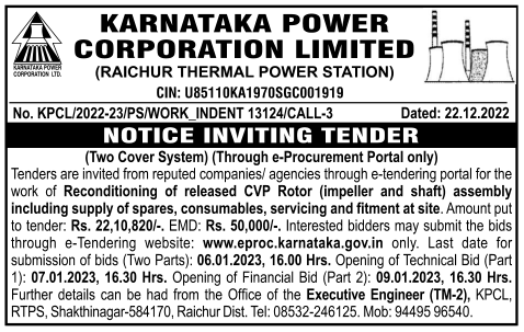Reconditioning of released CVP Rotor (impeller and shaft) assembly including supply of spares, consumables, servicing and fitment at site.