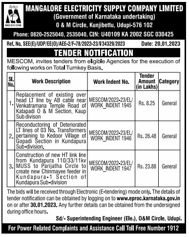 Tender for Reconductoring of Deteriorated LT lines of 03 No. Transformers pertaining to Kedoor Village of Gopadi Section in Kundapura Sub-division.