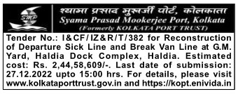 Tender for Reconstruction of Departure Sick Line and Break Van Line at G.M. Yard, Haldia Dock Complex, Haldia.