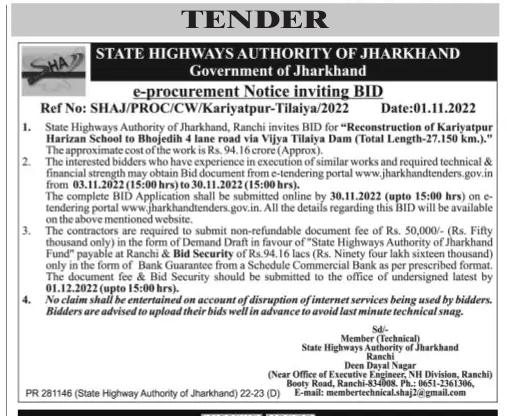 Tender for “Reconstruction of Kariyatpur Harizan School to Bhojedih 4 lane road via Vijya Tilaiya Dam