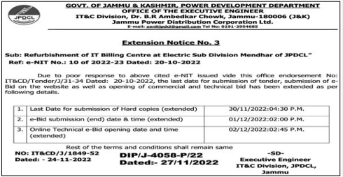 Tender for Refurbishment of IT Billing Centre at Electric Sub Division Mendhar of JPDCL” Ref: e-NIT No.: 10 of 2022-23
