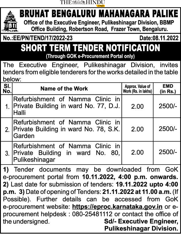 Tender for Refurbishment of Namma Clinic in 3. Private Building in ward No. 80, Pulikeshinagar