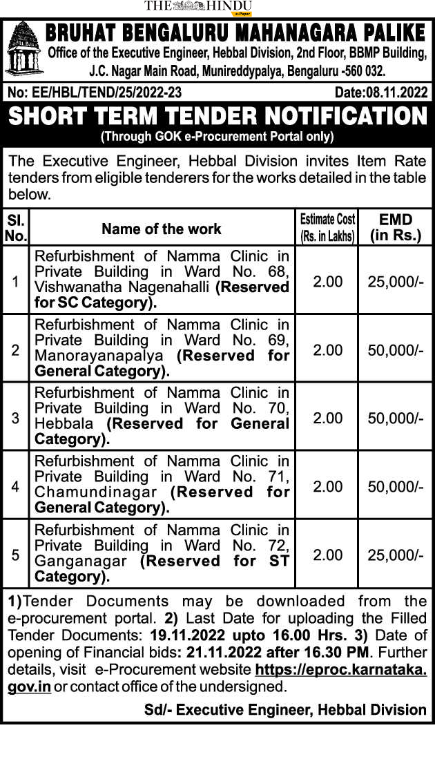 Tender for Refurbishment of Namma Clinic in Private Building in Ward No. 70, Hebbala (Reserved for General Category).