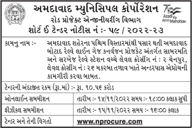 Regarding construction of underpass approach at Level Crossing No: 2 Chenpur, Level Crossing No: 26 at Makarba Lake between Sabarmati and Sarkhej Railway Station under the Ahmedabad Botad Railway Line Gauge Development Project passing through the western area of ​​Ahmedabad city.