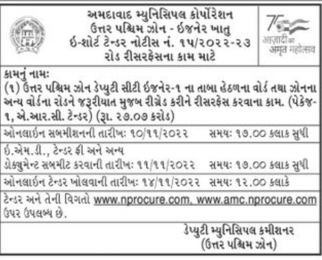 Tender for Regrading and resurfacing the roads of the ward under the control of North West Zone Deputy City Engineer-1 and other wards of the zone as required. (Package 1, ARC Tender) (Rs. 27.07 Crores)