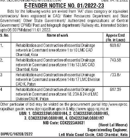 Tender for Rehabilitation and Construction of essential Drainage network in Command area of zone 14 to 17 LMC Division CAD K. Patan
