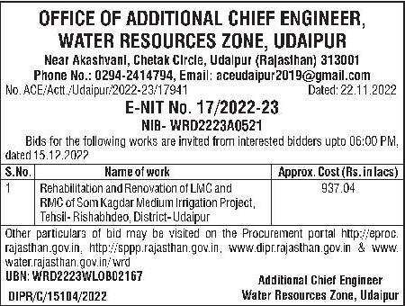 Tender for Rehabilitation and Renovation of LMC and RMC of Som Kagdar Medium Irrigation Project, Tehsil-Rishabhdeo, District-Udaipur