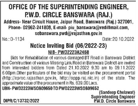 Tender for Rehabilitation of various damaged BT Road in Banswara District and Construction of various Missing Link Road in Banswara District