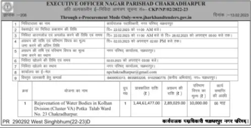Tender for Rejuvenation of Water Bodies in Kolhan Dvision (Cluster VA) Potka Talab Ward [ No. 23 Chakradharpur