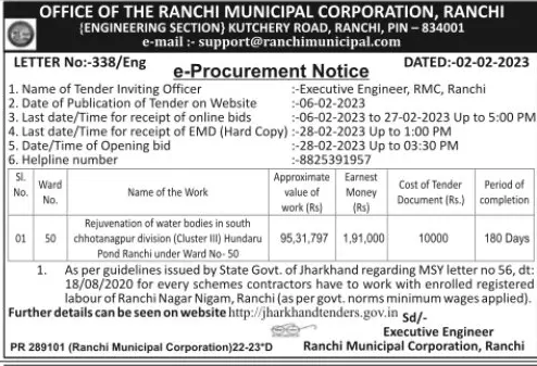 Tender for Rejuvenation of water bodies in south chhotanagpur division (Cluster II) Hundaru Pond Ranchi under Ward No-50