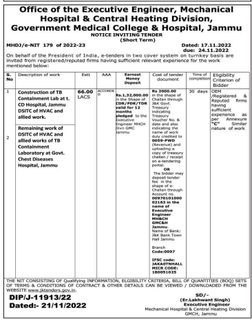 Tender for Remaining work of DSITC of HVAC and allied works of TB Containment Laboratory at Govt. Chest Diseases Hospital, Jammu