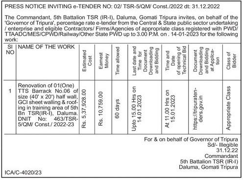 Tender for Renovation of 01(One) TTS Barrack No.06 of size (40′ x 20′) half wall, GCI sheet walling & roof- ing in training area of 5th Bn TSR(IR-1), Daluma. DNIT No: 463/TSR- 5/QM/ Const./2022-23