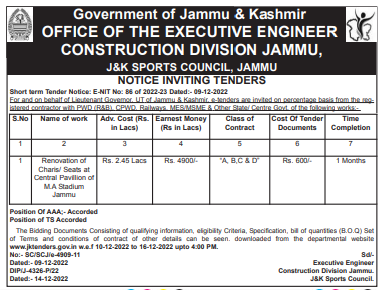 Tender for Renovation of Charis/ Seats at Central Pavillion of MA Stadium Jammu.