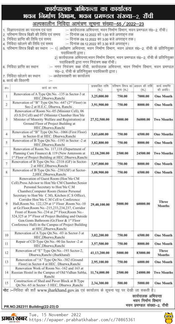 Tender for Renovation of “E” Type Qtr No.-193 Sector-2. Dhurwa, Ranchi (Jharkhand)