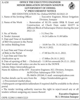 Renovation of M.I.Ps under RR& R Grant and Construction of Check Dam under MATY in different Block of Subarnapur District during the year 2022-23.