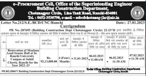Tender for Renovation of Maulana Azad Senate Hall at In Ranchi University Campus at Sahid Chowk, Ranchi for the Year 2022-23
