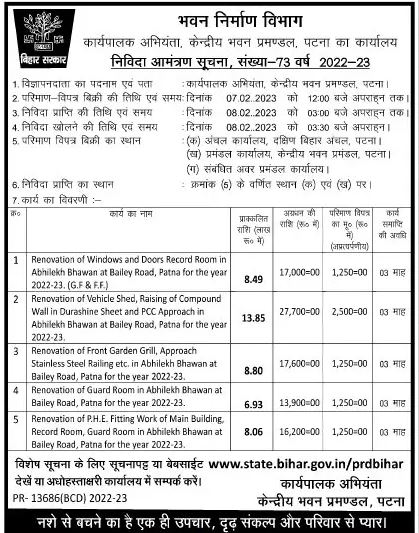 Tender for Renovation of Vehicle Shed, Raising of Compound Wall in Durashine Sheet and PCC Approach in Abhilekh Bhawan at Bailey Road, Patna for the year 2022-23.