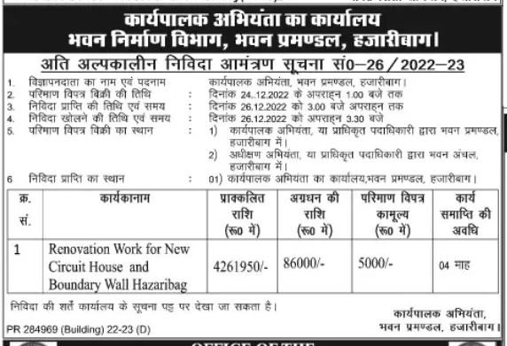 Tender for Renovation Work for New Circuit House and Boundary Wall Hazaribag