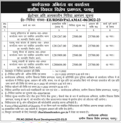 Tender for Repair and construction of Block cum Zonal Office Building and related residential building of Palamu Hariharganj