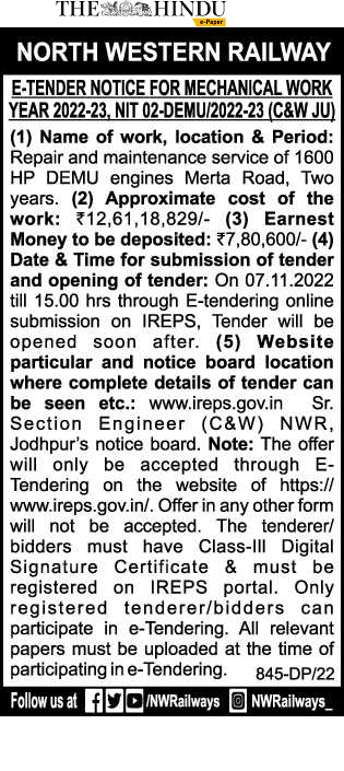 Repair and maintenance service of 1600 HP DEMU engines Merta Road, Two years.