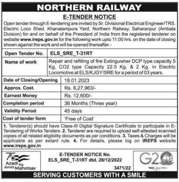 Tender for Repair and refilling of fire Extinguisher DCP type capacity 5 Kg. CO2 type Capacity 22.5 Kg. & 2 Kg. in Electric Locomotive at ELS/KJGY/SRE for a period of 03 years.