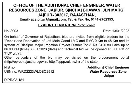 Tender for “Repair and Renovation of Left Main Canal LMC and RMC 0 Km to 48 Km and its system of Bisalpur Major Irrigation Project District Tonk”