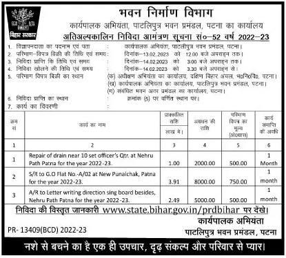 Tender for Repair of drain near 10 set officer’s Qtr. at Nehru Path Patna for the year 2022-23