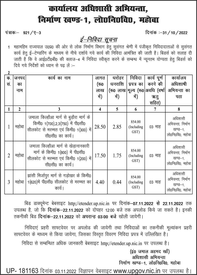 Tender for Repair of PC Sealkot in km 1 (700).2.3 (750) from Jamala Kilhoua road to Budaura road and CC work in km 1 (300)