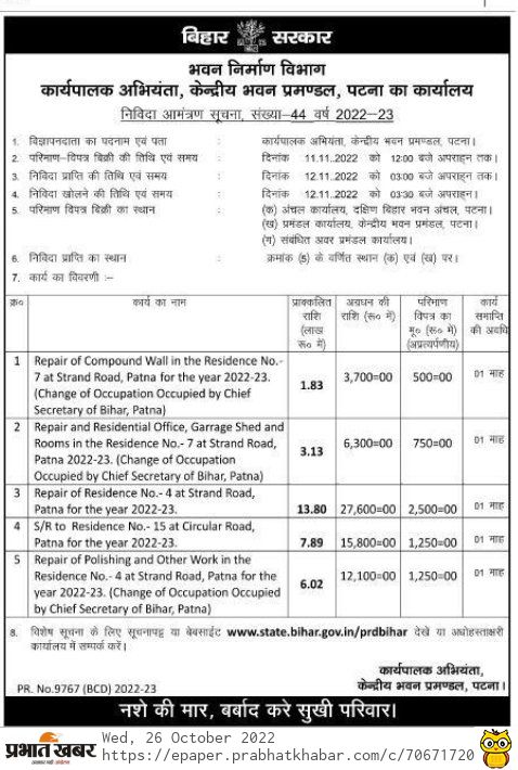 Tender for Repair of Residence No.-4 at Strand Road, Patna for the year 2022-23.