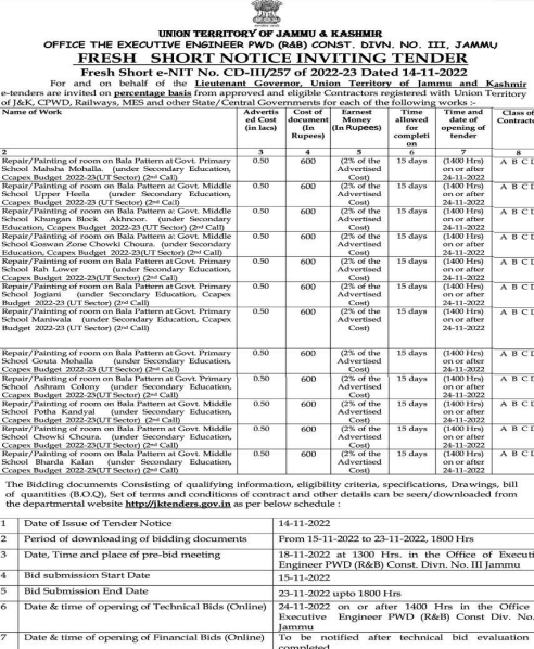 Tender for Repair/Painting of room on Bala Pattern at Govt. Middle 0.50 15 days School Upper Heela (under Secondary Education, on or after Ccapex Budget 2022-23 (UT Sector) (Call)