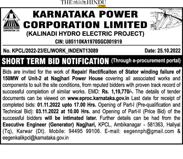 Tender for Repair/ Rectificaiton of Stator winding failure of 150MW of Unit-2 at Nagjhari Power House covering all associated works and components to suit the site conditions, from reputed bidders with proven track record of successful completion of similar works.