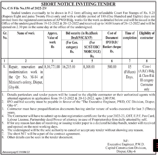 Tender for Repair, renovation and modernization work in the Qtr No. M-14 at Minister’s colony, Dispur, Ghy-06.