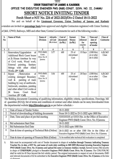 Tender for Repair /Renovation of existing damaged Boundary wall & painting of main building by way of earthwork, brickwork, emulsion, painting and other allied Civil works at JK house, Court Road Amritsar. (3 Call)