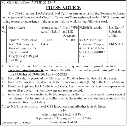 Tender for Repair & Renovation of Guard Wall along the Banks of Bharalu River from RGB Road Bridge(Jonali) to Rajgarh Road Bridge.