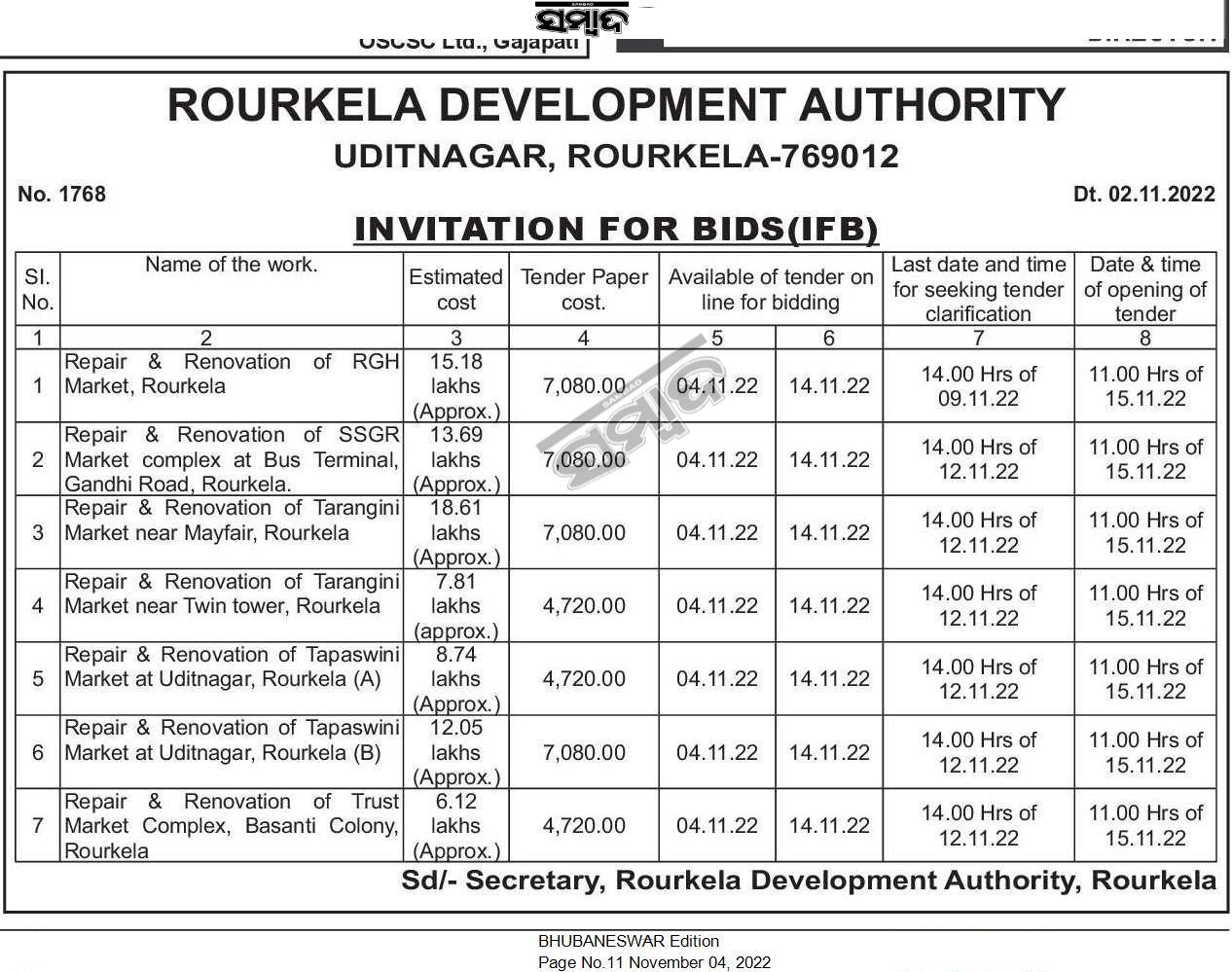 Tender for Repair & Renovation of Tarangini Market near Twin tower, Rourkela